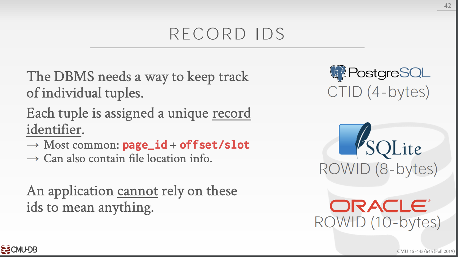一些DBMS会要求这些页是self-contained的,即这个页本身包含了所有访问该页的所有信息。